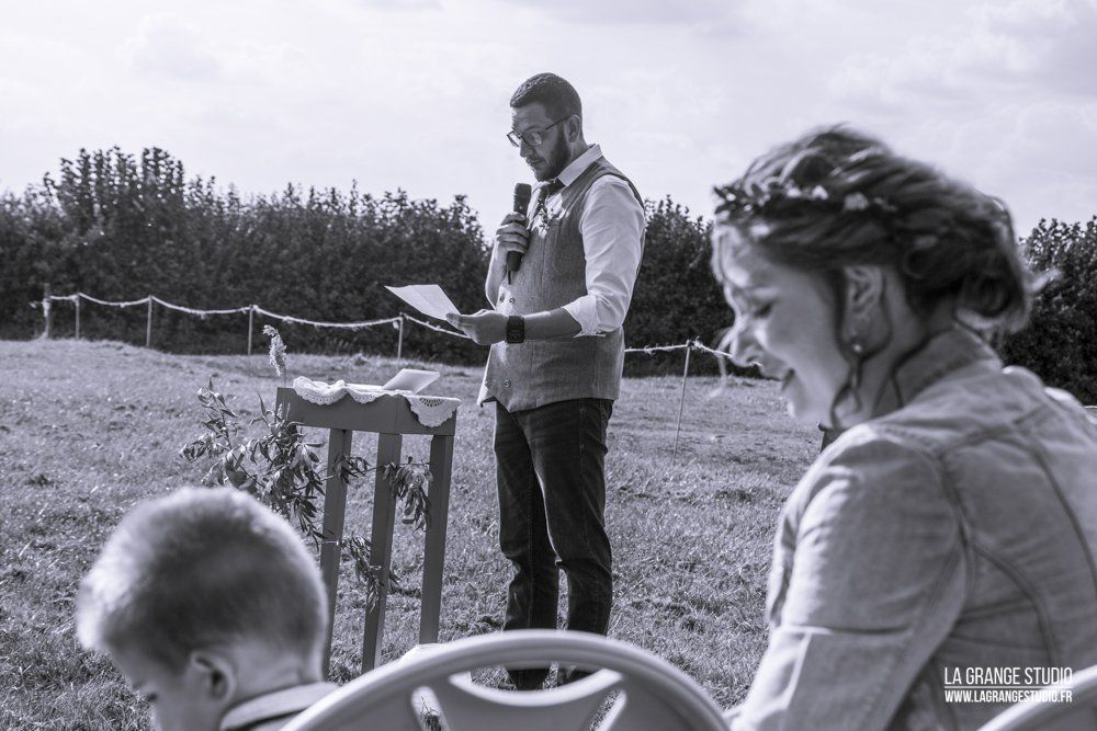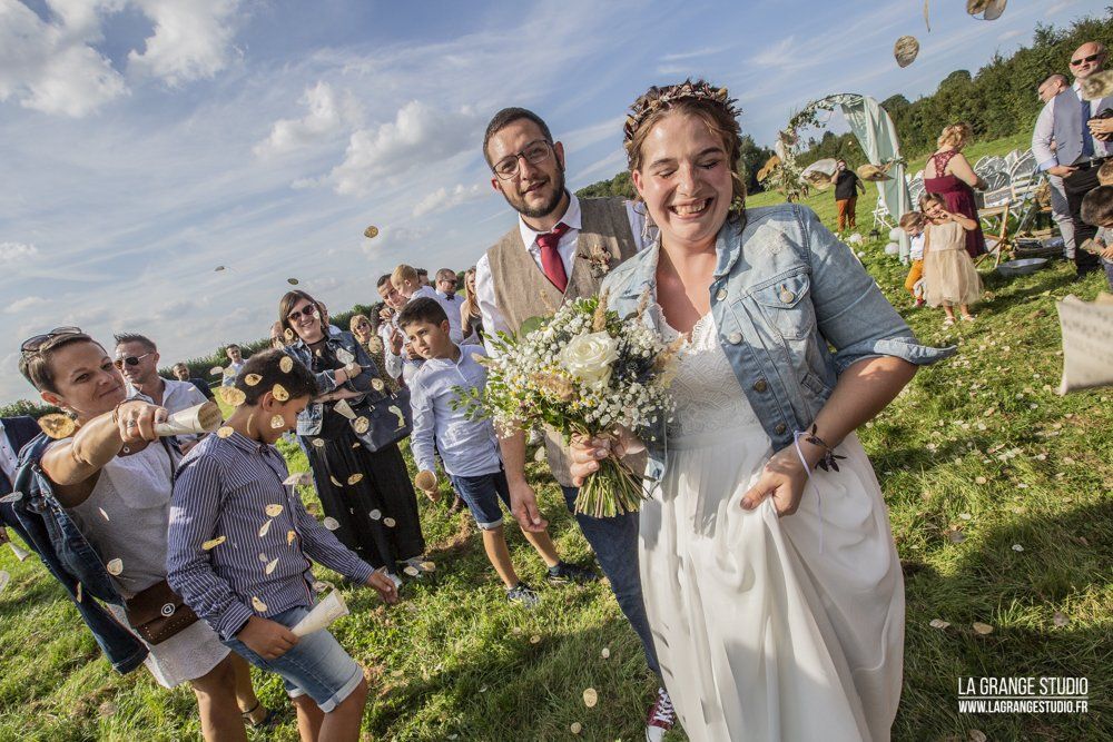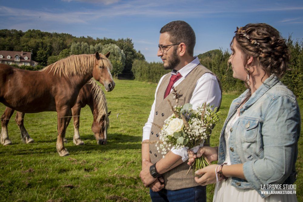 Le reportage photo commence par l'arrivée des invités à la cérémonie laïque à la Ferme Beck qui dispose de chambre d'hôtes, puis le vin d'honneur en extérieur, la soirée et le gâteau dans cet endroit verdoyant, disposant de plusieurs salles de réception individuelles ...